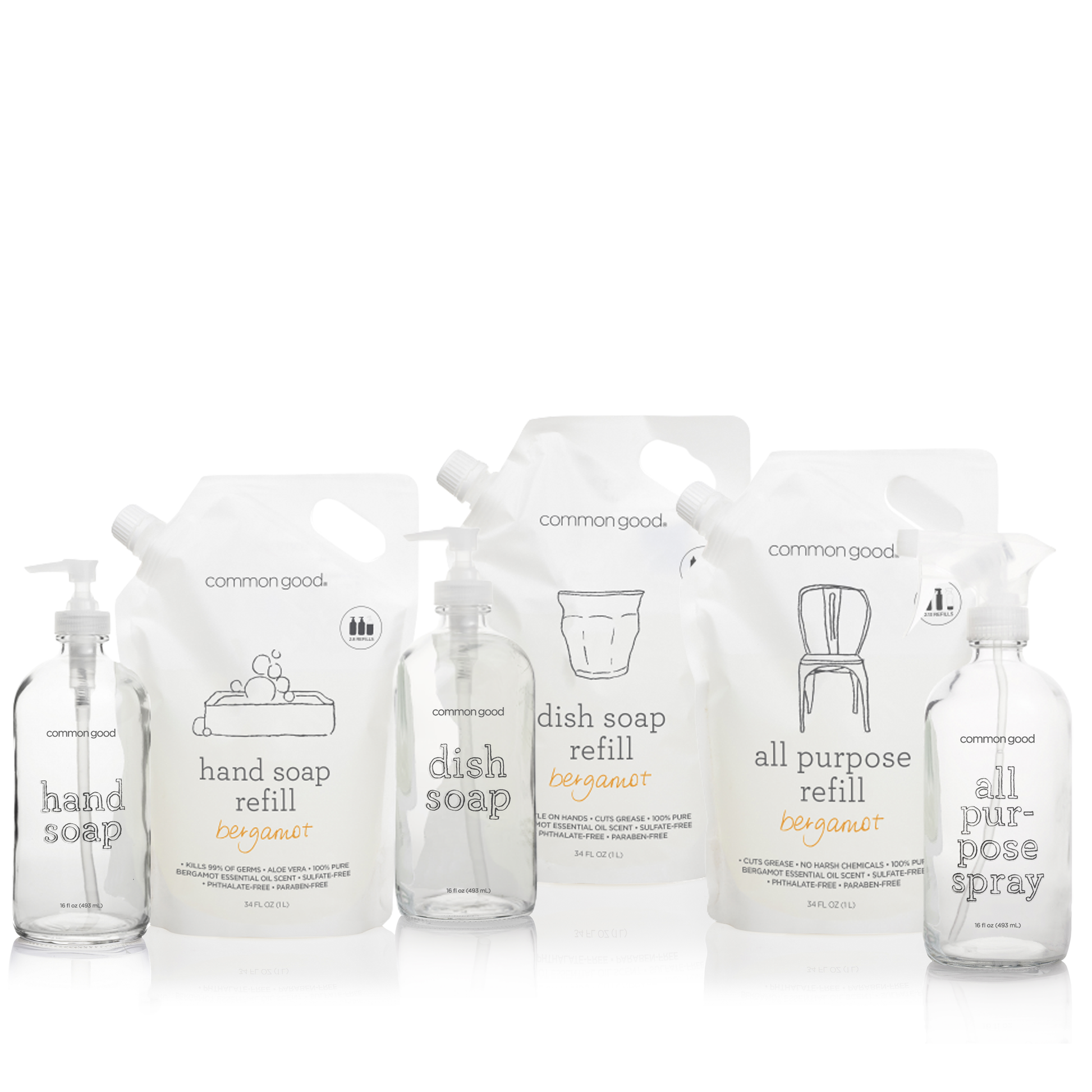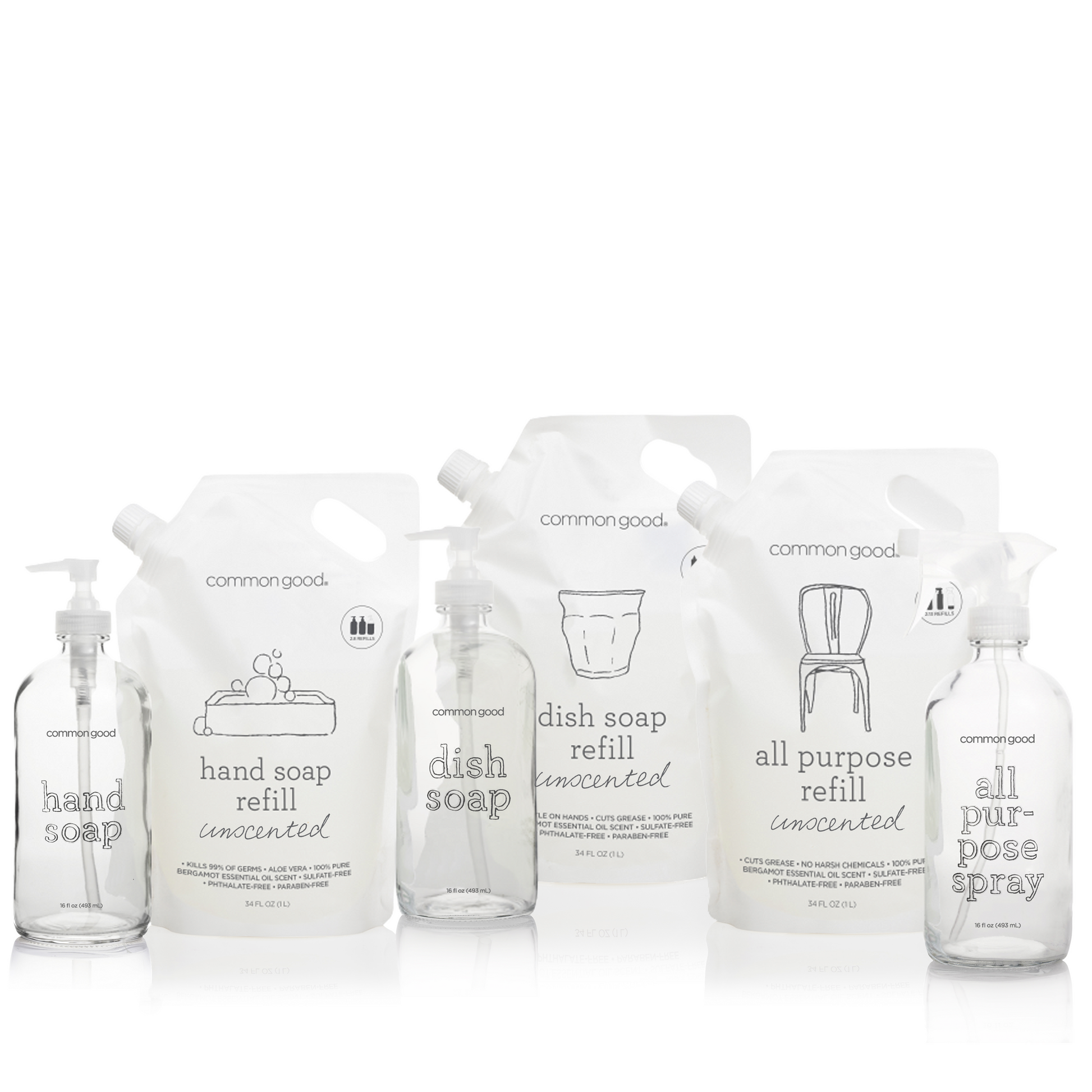 A simple way to start a lower-waste routine. This set includes our best-selling All-Purpose, Dish, and Hand Soap refill pouches, plus three durable, reusable glass bottles—everything you need for a cleaner home with less plastic.