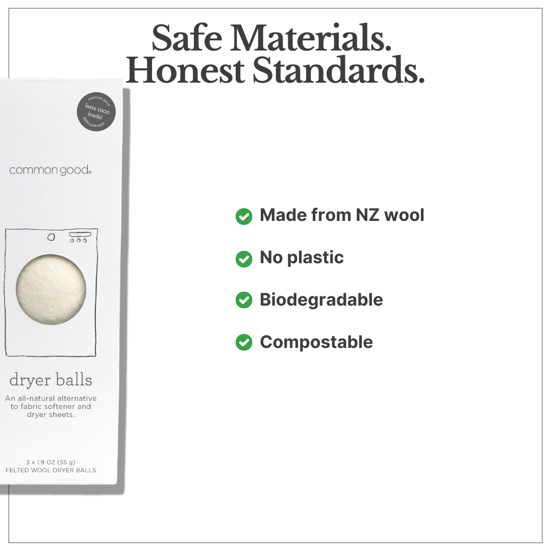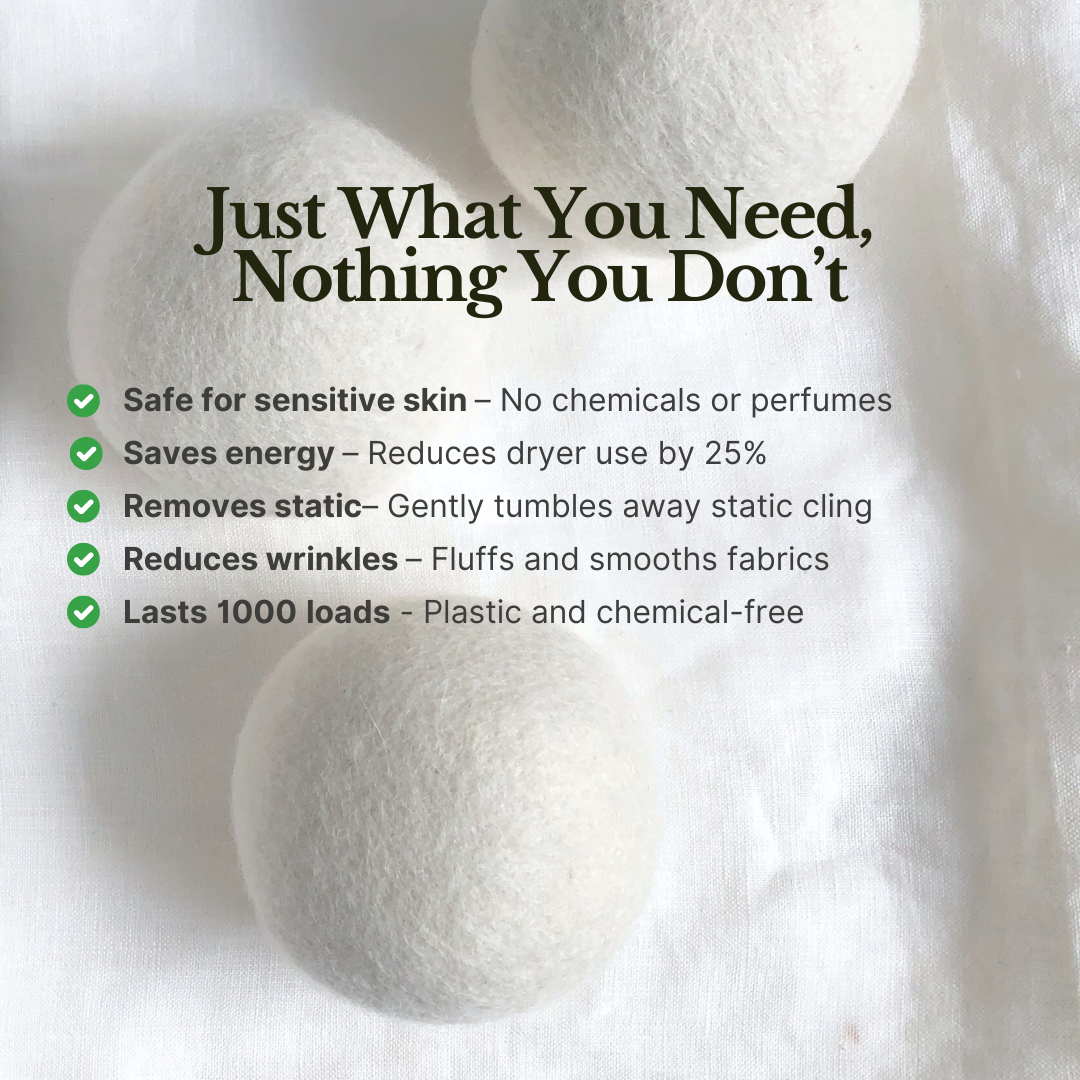 Made from 100% natural wool, our Dryer Balls soften clothes, reduce static, and speed up drying—no synthetic chemicals, no waste. Use all three per load for over 1,000 cycles of fluffier laundry and lower impact.