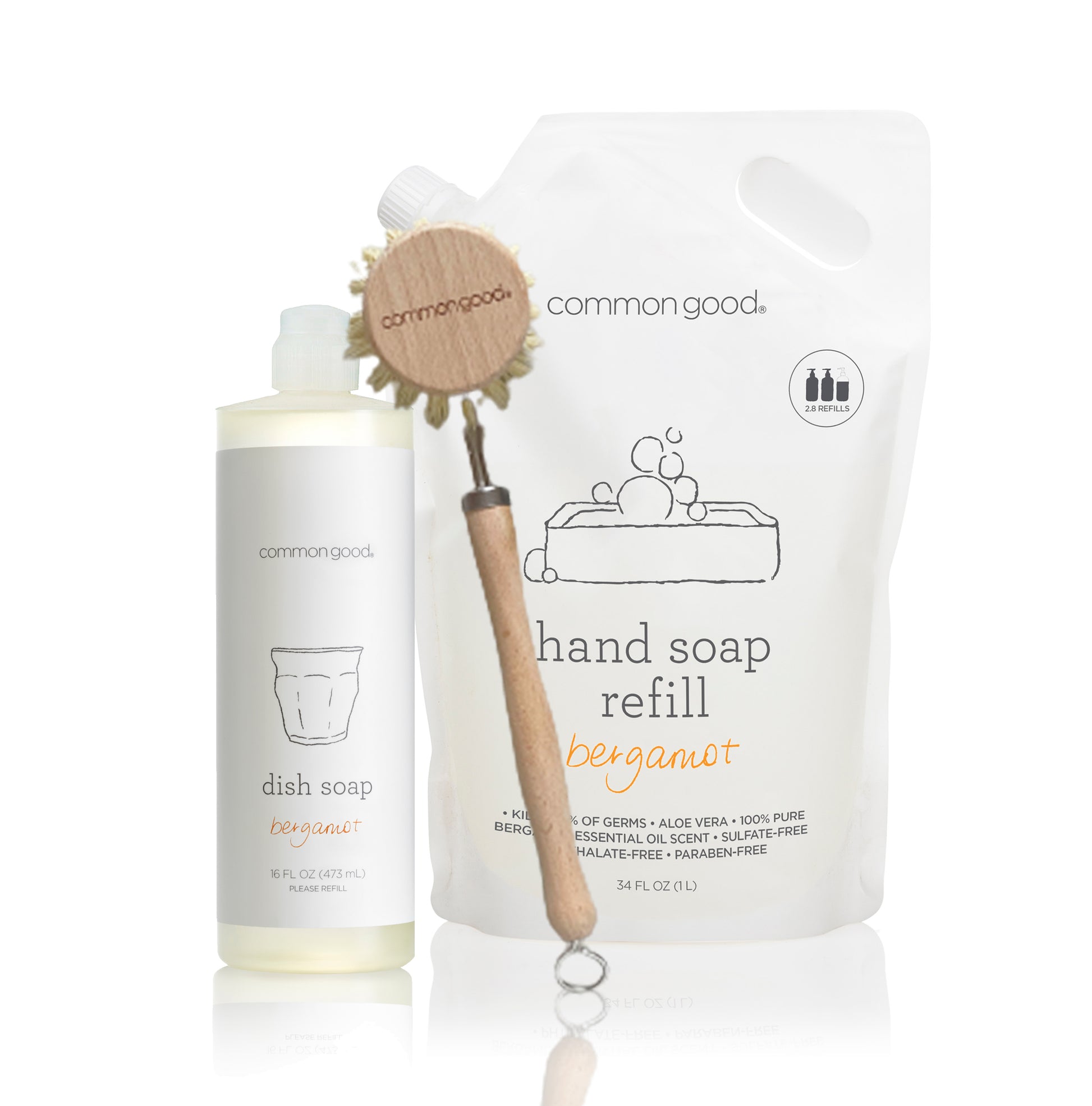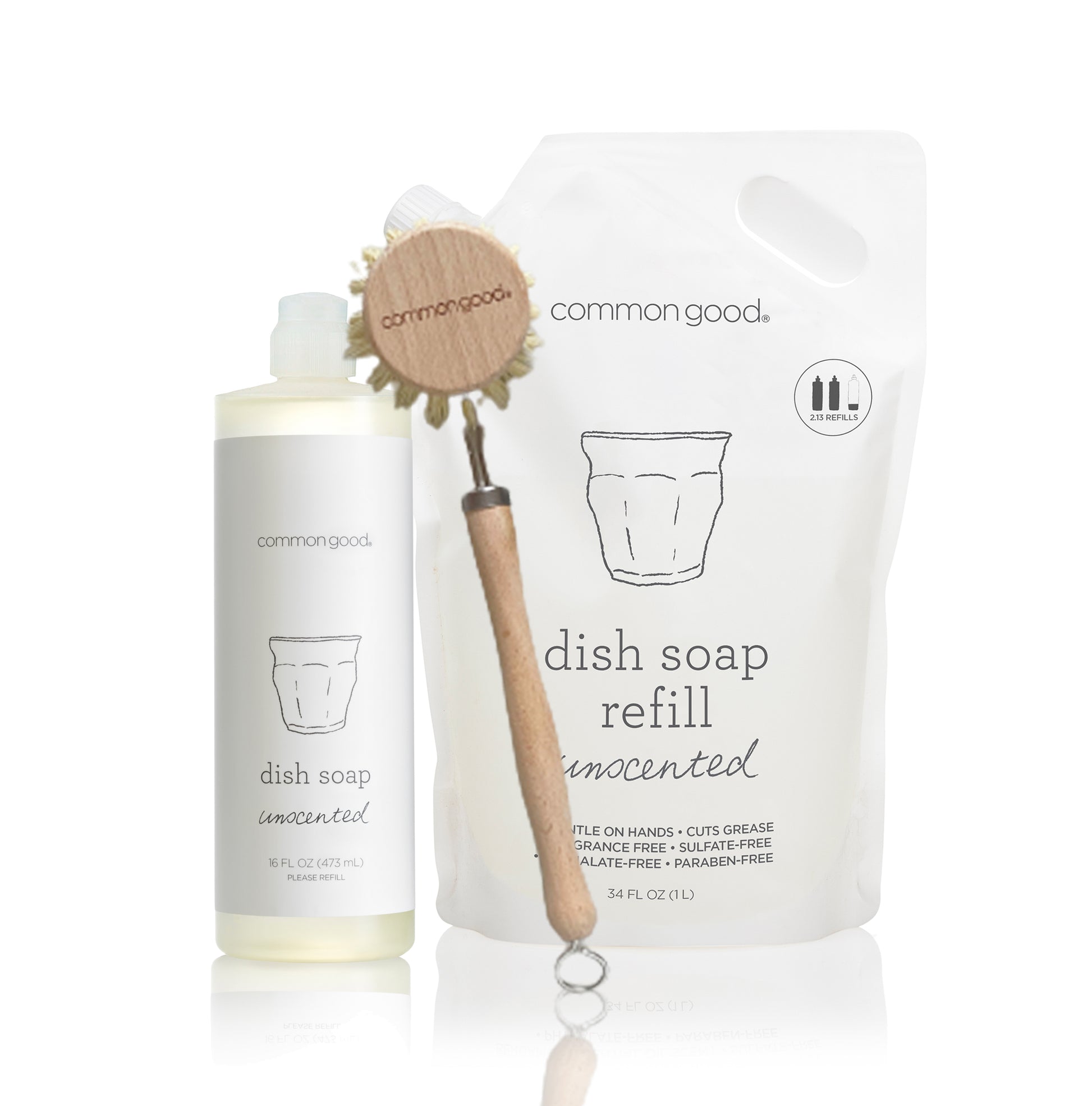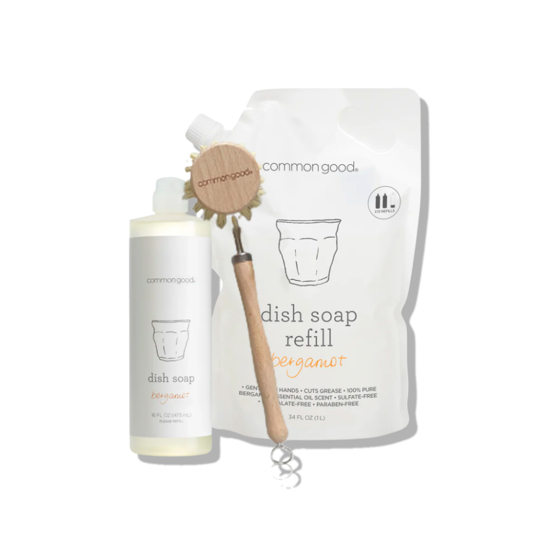 Everything you need for a cleaner kitchen, without the waste. This set includes a 16 oz bottle of grease-fighting Dish Soap, a 34 oz refill pouch that saves over 83% plastic, plus durable, low-waste tools like our sisal brush and Swedish cloth. Safe ingredients, zero nonsense.