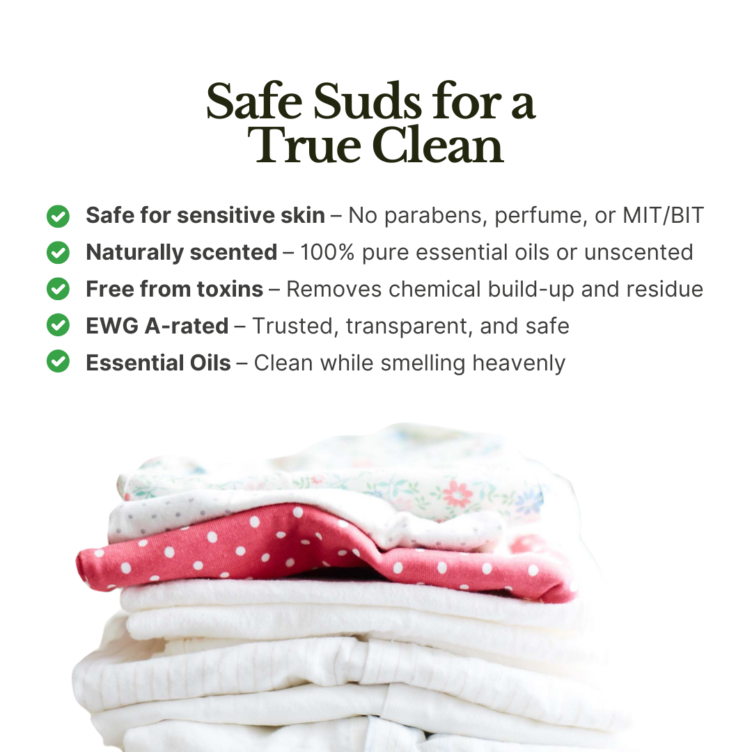 Upgrade your laundry routine with this sustainable set. It includes a refillable 16 fl oz glass bottle and a 34 fl oz Laundry Detergent refill pouch, combining safe cleaning with less waste.