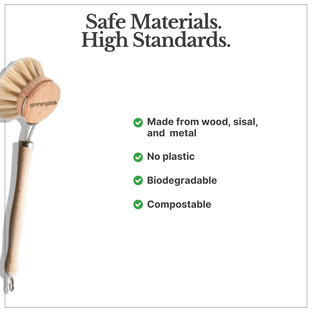 Use with your favorite dish soap to scrub dishes, pots, and pans. Rinse and allow to air dry after each use. Compost the bristles and dispose of the teakwood base sustainably when it’s time to replace.